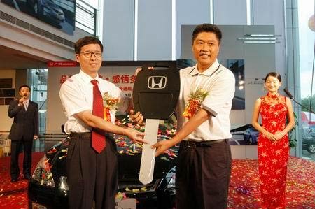 廣州本田蔣平副總經(jīng)理(左)交鑰匙給首位用戶