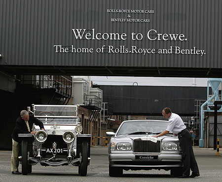 左邊是1907年的勞斯萊斯,與右邊的最后一輛勞斯萊斯形成鮮明的對比,后面是車廠的牌子,The home of Rolls-Royce and Bentley 的牌子將不復存在,并換成 The home of Bentley !