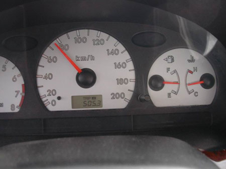 很快,我們又經(jīng)過(guò)了900公里的里程牌,我和老婆的手也緊緊的握到了一起,沖!最后的100公里是那樣的漫長(zhǎng),腳已經(jīng)很疼很麻木了,但仍舊要牢牢的控制時(shí)速在80公里,在最后的階段這樣顯得尤為重要,時(shí)速表牢牢的指在80公里的位置,除了上下坡,上下差幅小于3公里。不知不覺(jué),我和老婆緊握的手已經(jīng)被汗?jié)裢噶耍覀兌荚跒樽约海瑸樾●R捏著一把汗。前方的路好象永遠(yuǎn)也走不到頭,燃油報(bào)警等依舊那么刺眼的亮著,眼看著里程表一點(diǎn)一點(diǎn)的走字,950、960、970、980…… 終于,馬上就要接近1000公里了,我們臉上都露出了喜悅的表情,到了,馬上就要到了,但同時(shí)我們也都擔(dān)心不知道小馬還能否堅(jiān)持走完這最后的十幾公里。終于,近了,近了,998、999、1000!!