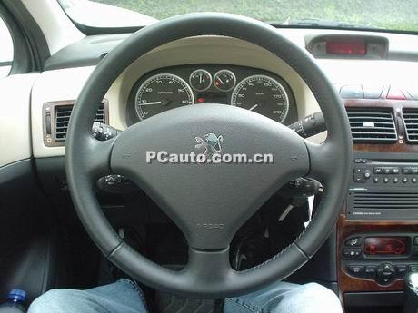 標致307是新車,我們不妨看一看他的內部,帶氣囊的三幅式方向盤。