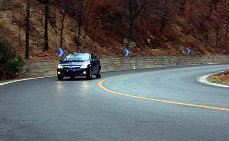 在晨霧皚皚的山間,蜿蜒路面上蒙著一層薄薄的白霜,零星的坑洼處已被車輪軋實軋臟的積雪填平,遠遠看去并不容易被發現;前一夜還在擔心是否封山的黃銳,現在正在趕超一輛輛慢吞吞爬山的大貨車,真的有點樂不知返了。連續盤山道中有時油門偏大,會稍微感覺到轉向不足的趨勢,但整個車身還是像被吸在地面上一樣,扎實的底盤發揮優勢,安全出彎不是問題。視線逐漸開闊,山路開始轉入下坡連續三個彎道,車速有些偏快。