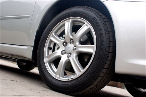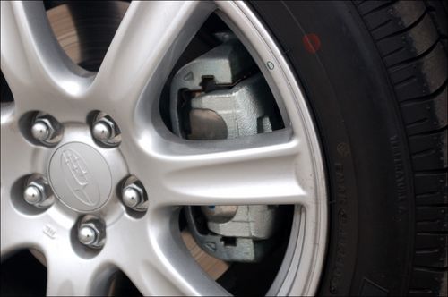 裝在16寸6幅新型輪轂后面的,是前2活塞后1活塞的卡鉗,加前270mm(通風)后250mm剎車盤。力獅Wagon的剎車系統保持著斯巴魯的一貫風格,那就是在踏板的力道上前半程相對比較軟,中后段逐漸開始發力,在正常使用中感覺這套剎車系統很讓人放心。雖然制動效果尚可,但原廠剎車片相對較軟,在制動過程中會產生大量的黑色粉末,不但對于車胎、輪轂的清潔很不利,更重要的會導致較快的磨損。