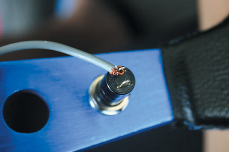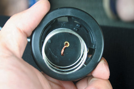 之后依圖示,將長約12公分的電線纏繞在喇叭蓋的中央金屬極板處,記得將電線剝長些,不要讓電線的絕緣外皮擋到中央極板,以免與快拆座接觸不良