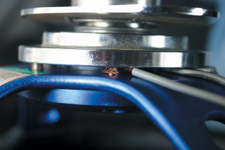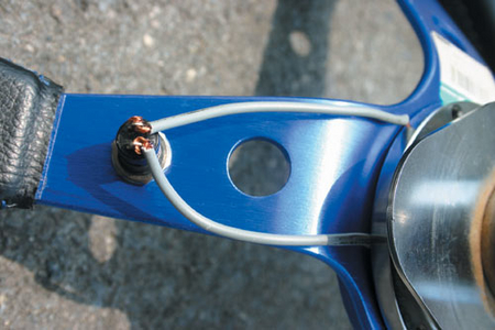 再利用4枚2mm厚度的華司,墊在方向盤與快拆座之間(上下左右各墊一枚),并鎖上快拆座固定螺絲,如此才能讓喇叭電線有空間可拉出來,又不會影響方向盤的平面角度