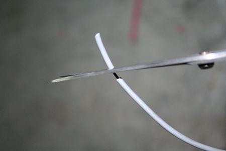 利用剪刀或剝線器,將準備連接燈座的電線外皮剝開。