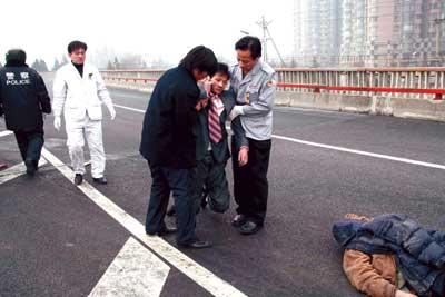 新郎一直跪在急救車上,999的醫(yī)護工作者提醒我,新郎情緒激動,讓我上車小心。我遞給他一張紙巾。他一言不發(fā)只是低聲啜泣。新郎的父親拽著兒子老淚縱橫,不停地叫喊:“我是你爸爸,你下來吧!