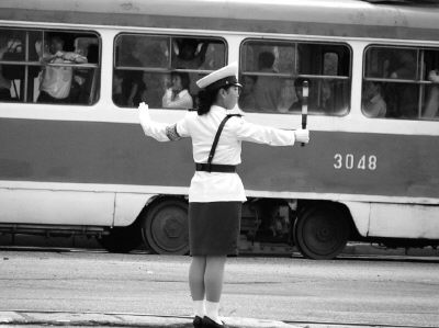 初到平壤,除了街頭良好的交通秩序外,更讓來訪者驚訝的是街頭的女交警,她們絕對可稱作“依拋誘”(朝鮮語“美女”)。這些略施粉黛的女交警上身著白色制式服裝,頭戴大沿帽,下著藍裙,交通指揮棒在手中舞動,夜色中指揮棒的反光色彩讓人誤以為是彩蝶飛舞。