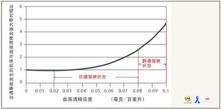 根據世界衛生組織的報告顯示:當駕駛人血液中酒精含量達0.08水平時(約相當于飲用3瓶500ml的啤酒或一兩半即80ml 56度白酒),發生交通事故的機會是血液中不含酒精時的2.5倍;達0.10水平時(約相當于飲用3瓶半500ml啤酒或2兩即100ml56度白酒),發生交通事故的機會是血液中不含酒精時的4.7倍。由此可見,即使在少量飲酒的狀態下,交通事故的危險度也可達到未飲酒狀態的2倍左右。