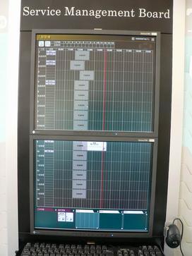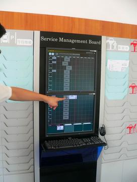 在拿到需要保養(yǎng)的車后,工作人員會把車子開進工作車間,同時把保養(yǎng)維修單交到車間主任手上,由車間主任通過豐田SMB系統(tǒng),統(tǒng)一分配具體車輛到空閑的工作間,由熟悉相關(guān)保養(yǎng)工作的技師,進行保養(yǎng)作業(yè),同時把汽車的情況通過CS系統(tǒng)傳輸?shù)娇蛻粜菹⑹业碾娨暺聊簧希蜍囍魈峁┳顚崟r的信息,通過上面的面板我們可以看到,車主及車輛的相關(guān)信息,已經(jīng)正在哪個環(huán)節(jié),據(jù)悉,這套系統(tǒng)也用在雷克薩斯品牌上。通過SMB的面板,可以讓主任實時了解整個車間的工作信息,具體到哪個車間是哪部車輛,正在進行何種作業(yè),剩余工作時間等都是一目了然,極大的方便主任布置工作,同時也提高的工作效率。