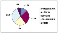 確實,許多本來打算購買SUV的消費者,到最后都買了轎車。有一份對北京消費者的調查能反映一些情況,被調查者大多無車,并有購車意向。結果63%的被調查者有意兩年內購買SUV,其中表示近期或一年內將購買的高達40%(見下圖)。