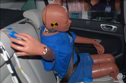 觀察完車頭,我們再沿著A柱向后看去。307的A柱本身和車頂依然沒有出現(xiàn)什么凹痕,由此漸漸明白了剛才工作人員對于307車頭吸能的評價。車門有輕微變形,但打開依舊輕松,不許太用力,當然更不需要什么工具。里面的假人姿態(tài)良好,氣囊上印痕清晰,后排女性假人坐姿端正,看來安全帶的工作也很正常。唯獨幅駕駛上的假人可能腿部與前手套箱的蓋子發(fā)生了一定的沖撞,留下了一道印痕。  車門輕微變形