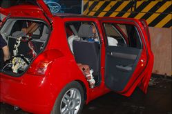 雨燕在本月19日進行的首天試驗是正面100%重疊剛性壁障碰撞試驗。在試驗中,一輛紅色雨燕以50Km/h的時速全寬度正面沖擊剛性壁障(此剛性壁障屬于不吸能物體,墻壁由鋼筋混凝土制成,表面覆有20mm厚膠合板)。撞擊的一瞬,雨燕前排的兩個安全氣囊順勢打開。需要指出,同樣作為A0級轎車,雨燕的副駕駛氣囊對于車內乘員的充分保護是上一期的主角——雅紳特所不具備的,值得肯定。除此以外,安全帶預緊裝置也是雨燕的安全標配之一。為什么要在這里重點提及雨燕的這兩項安全配置呢?在以前的文章中我們介紹過,正面100%重疊剛性壁障碰撞試驗雖然在強度和對車體結構沖擊方面不及40%偏置碰撞,但對于約束系統確是個嚴峻的考驗。 |