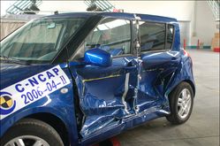 7月1日,國家《乘用車側面碰撞的乘員保護》(側碰)和《乘用車后碰撞燃油系統安全要求》(后碰)兩個標準正式實施,也就是說除了C-NCAP之外,國家的強制標準中也涵蓋了側面碰撞,足見其重要性。究其原因,這主要是側撞在實際交通事故中發生率很高,有統計顯示,在目前國內的車輛交通事故中,有1/3的車輛碰撞事故屬于側碰。移動壁障模擬側面形式過來的車輛,其行駛方向與試驗車輛垂直,移動壁障中心線對準試驗車輛R點,并以50km/h~51km/h(試驗速度不得低于50km/h)的速度撞向試驗車輛。移動壁障的縱向中垂面與試驗車輛上通過碰撞側前排座椅R點的橫斷垂面之間的距離應在±25mm內。在駕駛員位置放置一個EuroSID II型假人, 用以測量駕駛員位置受傷害情況。 采用歐洲標準的假人和移動變形壁障 由于剛剛起步,C-NCAP中的很多標準都移自于我們用車環境比較接近的歐洲。比如前排的兩個假人,它的型號是Hybird III型50%,重量約75為公斤。無論是重量還是身高體型,這個假人看上去都更像是西方人。除此以外,再比如側撞試驗中的移動臺車(也叫可變形移動壁)。它為上下2層構成,每層由3塊組成,并對每塊的性能要求規定了相應的標定程序。目前C-NCAP和歐洲的Euro-NCAP中使用的車臺重量為950kg,而美國試驗所使用的車臺重量則為1368kg。這些數據如何規定的呢?自然是考慮到自身的用車環境,歐洲銷售的車輛的平均空車重為850kg,再加上1.6的平均乘員數。美國亦是如此,畢竟美國大車居多。 版權聲明:本文版權歸太平洋汽車網所有。未經授權不得擅自轉載!轉載請注明出處,否則一經發現,必將追究。 |