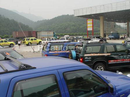 進入關卡交費,超過5輛車排隊,所有的通道都打開供車輛通過