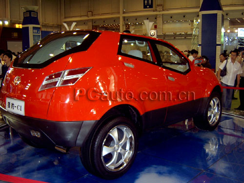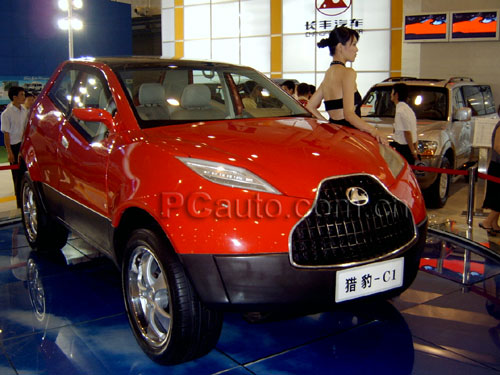 從外形上來看,“獵豹C1概念車”是一臺典型的SUV,由此可以看出長豐汽車對越野車的概念的理解已和世界同步了。這臺“獵豹C1概念車”不論從哪個角度看都堪稱完美,它的腰線較高,從前輪翼子板一直上升到尾部。使側面形成一個動感十足的楔形,加上寬大厚實的翼子板所營造出肌肉感和十九寸超寬胎所帶來相當的霸氣。